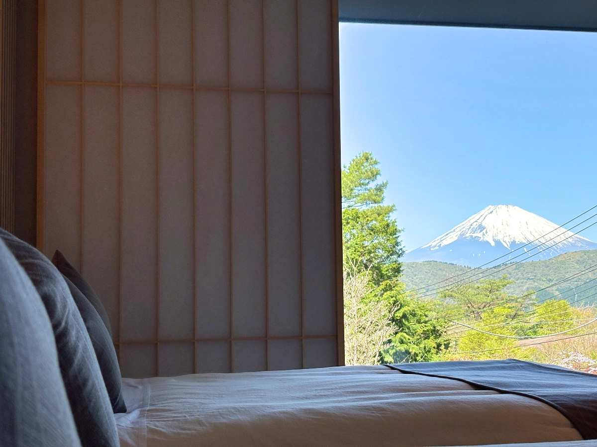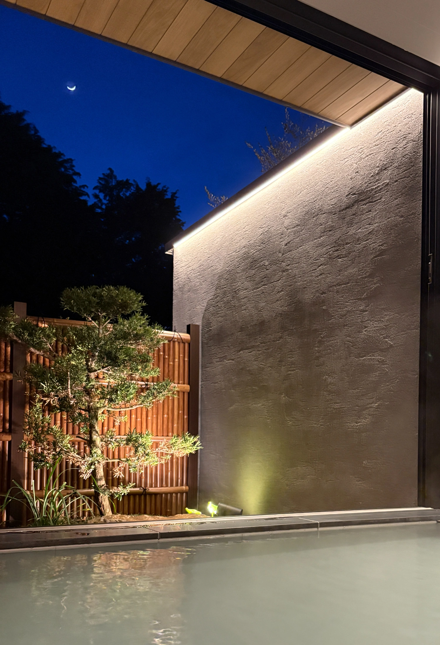 富士を望む静寂の森に 静かに佇むプライベートな隠れ家 湯音に心ほどける、掛け流しの天然温泉 熱と香りに包まれる、プライベートサウナ 空を仰ぎ、深く息をするテラスでのひととき
